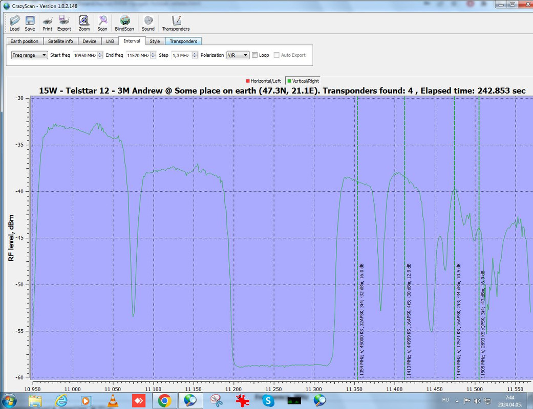 Ma gindisem la el cind am incercat eu insumi sa gasesc transponderul cu Satback cind a fost activat la aceasta pozitie. Alti pasionati,din alte zone ale contientului,cu antene mari au incercat si ei sa detecteze semnalul pe 11043 V,dar fara succes.