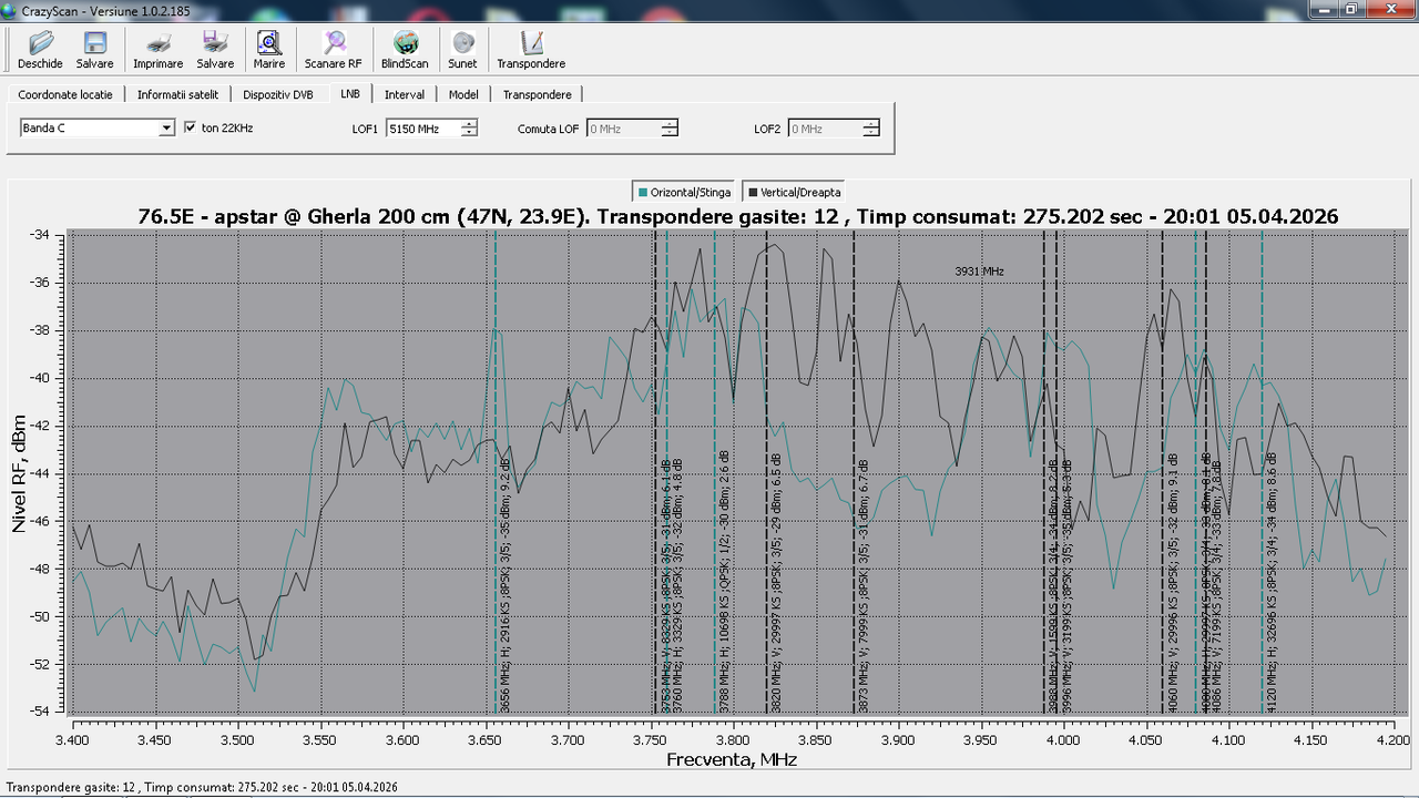 Nu știu de ce nu folosești Tuner 5927 USB. Cu spectrul Crazyscan obținut, am avea o imagine despre recepția obținută la pozițiile pe care le vizitezi.