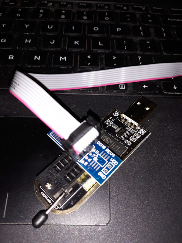 Se conecteaza una bucata soic8 pe dansu pana primim ceva date din eprom (ATETIE aici se utilizeaza soft pentru CH341A v1.34 obligatoriu), acesta fiind incapatnat cu ajutorul smd-urilor din preajma nu ne permite conectarea corecta a soic-ului.
