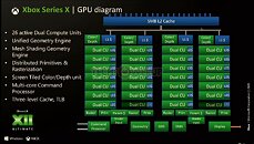 The RDNA2 GPU powering the Xbox Series X SoC features 52 compute units spread across 26 RDNA2 dual compute units. The silicon itself physically features two additional dual CUs (taking the total physical CU count to 56), but are disabled (possibly harvesting headroom). We've detailed first-generation RDNA architecture in the "architecture" pages of our first AMD Radeon RX 5000-series "Navi" graphics card reviews, which explains much of the SIMD-level innovations from AMD that help it drive a massive SIMD IPC gain over the previous-generation GCN architecture. This hierarchy is largely carried over to RDNA2, but with the addition of a few SIMD-level components.