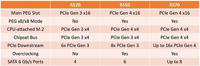 Motherboards based on the AMD A520 completely lack PCIe Gen 4 support, even with a Ryzen 3000 "Matisse" processor. Even the PCI-Express x16 and M.2 NVMe slots wired to the AM4 SoC are limited to PCIe Gen 3. On the B550, these two slots run at Gen 4 speeds when paired with a capable processor. Much like the B550, the downstream (general purpose) PCIe lanes from the chipset run at PCIe Gen 3 speeds, although unlike the B550, the chipset only puts out 6 lanes. Other platform I/O includes up to five 10 Gbps USB 3.2 ports (includes two from the AM4 SoC), two 5 Gbps USB 3.1 ports, four SATA 6 Gb/s (AHCI-only) ports, and six USB 2.0 ports. At launch, A520 motherboards only support Ryzen 3000 "Matisse" processors, with support planned for 4000G "Renoir" processors when they launch in the retail channel, and future "Zen 3" processors, through firmware updates.