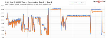 Overall, a stock Core i5-11400F paired with DDR4-3733 MHz memory, was found to be 1.5% faster with Gear 2, when averaged across all our CPU tests, compared to Gear 1 at the same 3733 MHz frequency. Gear 2 was 3.42% faster in Cinebench R23 multi-threaded, and a staggering 6% in MySQL. Across rendering and media workloads that scale across all cores, we find Gear 2 faster by 1-3%. It's only with less parallelized workloads such as gaming, where we see Gear 2 lag behind Gear 1, though not by much. In our i5-11400F review, we show that by running your processor in Gear 2, you're making your memory controllers pull less power, freeing up power budget for the CPU cores, translating into the nT performance gains we see here. We discovered that the uncore can pull anywhere between 5 to 10 W more power in Gear 1 mode. This is valuable power eating into the already constrained power-budget of this 65 W TDP chip.