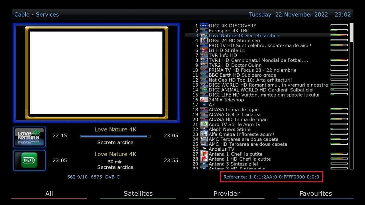 Va Salut ! Ma puteti ajuta (PM) cu Service Reference pentru Love Nature 4k introdus recent la RDS (subtitrat romana) ? Pentru Eurosport 4k si Digi 4k am gasit pe net (1:0:1F:2A8.... si 1:0:1F:2A9... ) Nu am decodor !