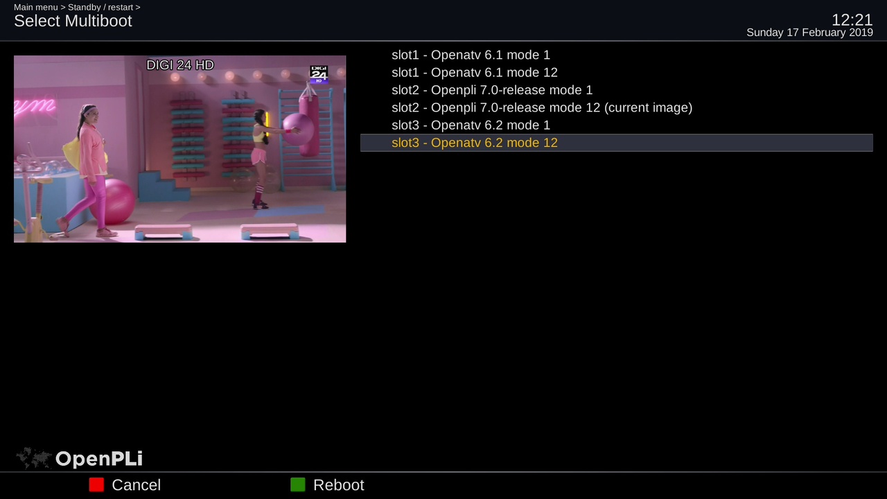 Step 1: Press MENU on your remote and go to Standby/Restart then go to Multiboot and press OK