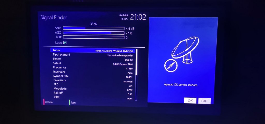 Salut, deja mi-e frica sa-ti raspund nu vreau sa fiu acuzat de faptul ca fac offtopic ,de abia astept sa primesc contul meu vechi inapoi...Cred ca problema este faptul ca nivelul BER este peste 1000 de obicei (la captura este 169 dar trece si de 1000) ,am facut aceste capturi la ora 15:00 o sa verific semnalul mai tarziu stiu ca semnalul poate avea o usoara crestere in orele tarzii.mersi pt. sfat.