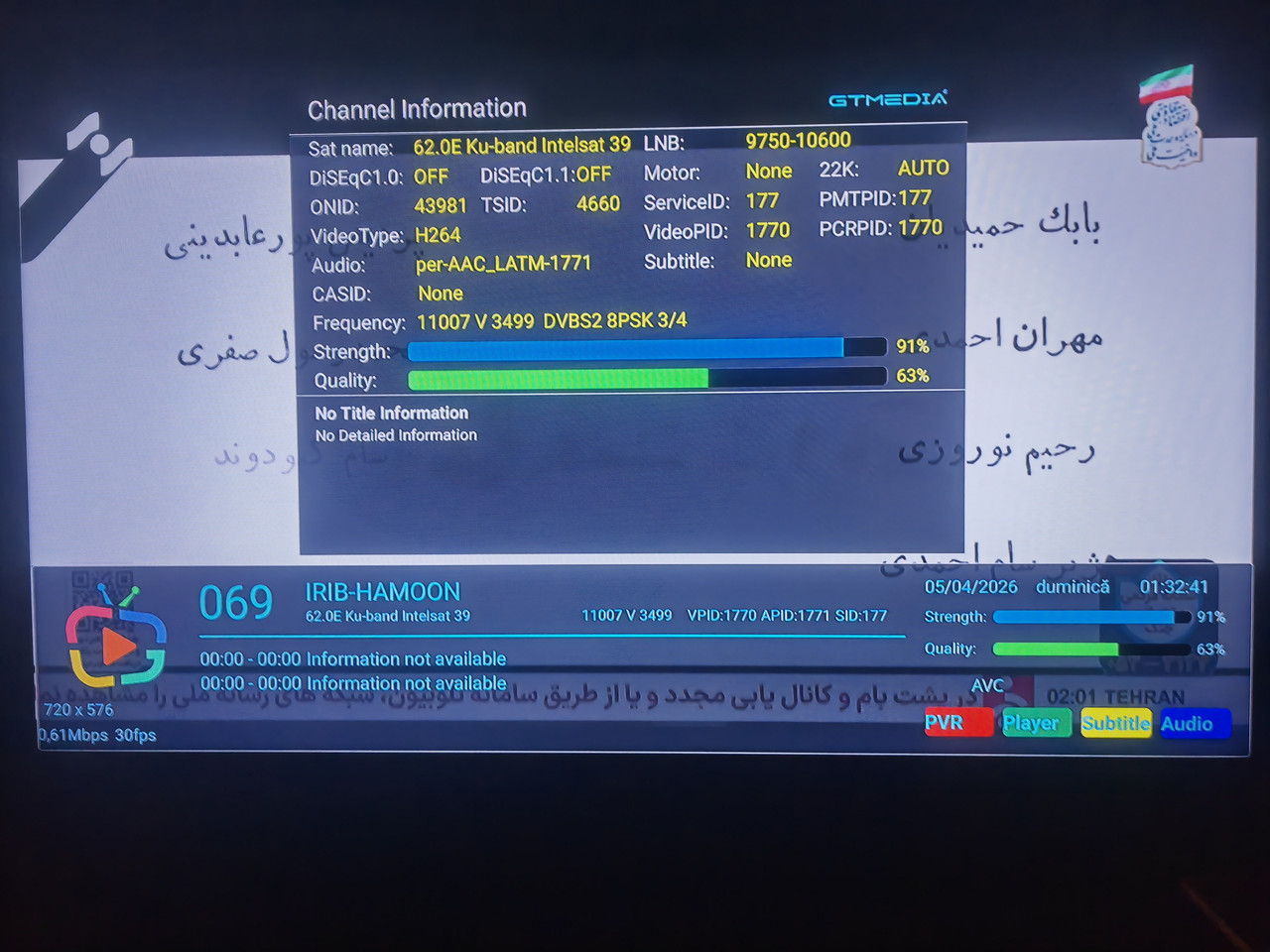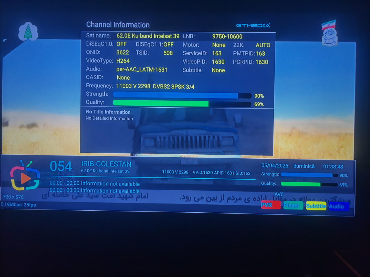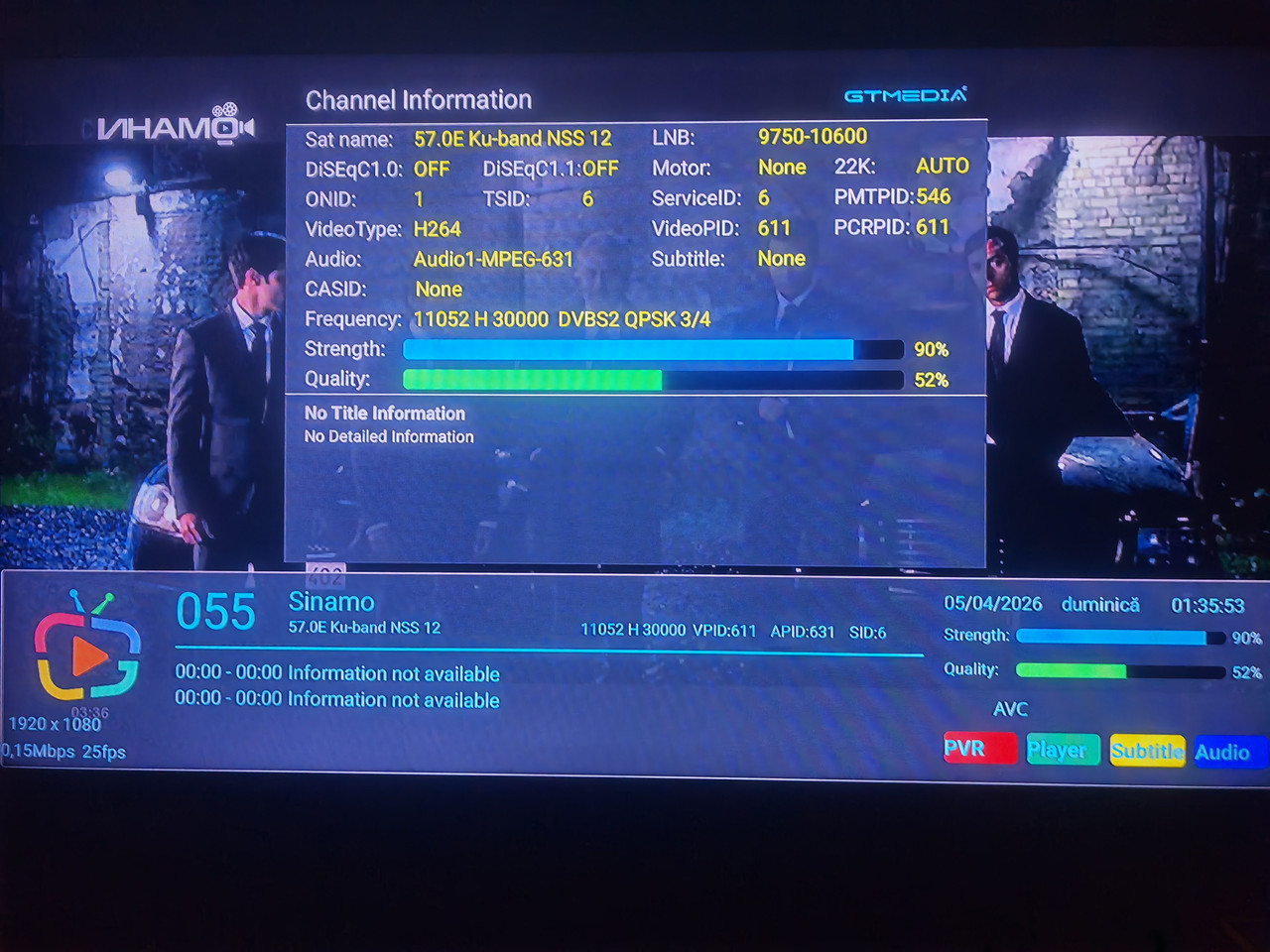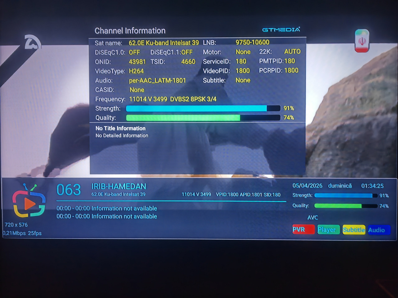 Pt cei interesati in receptionarea frecventei 11054 h 30000 (pachet canale Tadjikistan) de pe NSS 12 57 est spotul Central Asia, am urmarit in aceste zile felul cum se comporta semnalul. La offsetul 1.9 m in zona Cluj , semnalul capabil de a fi blocat apare in jurul orei 3 dimineata, cu un maxim de semnal in jurul orelor 8 - 10 si apoi scade in jurul orelor 12 pana la nivelul de unlock.