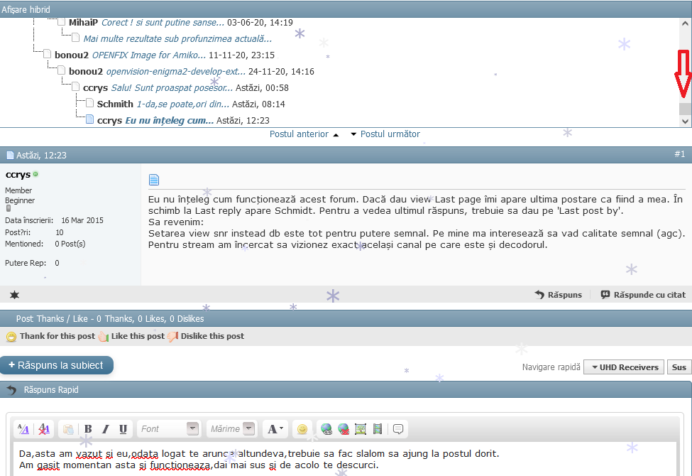 Eu nu înțeleg cum funcționează acest forum. Dacă dau view Last page îmi apare ultima postare ca fiind a mea. În schimb la Last reply apare Schmidt. Pentru a vedea ultimul răspuns, trebuie sa dau pe 'Last post by'.