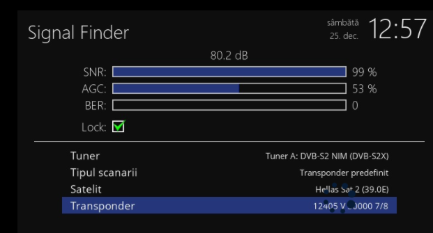 cat este nivelul semnalului pe frecventa 12405V30000 (Hellas 39E) ? de exemplu pe Turksat 42E sau Astra 28.5E nu sunt probleme cu semnalul ?