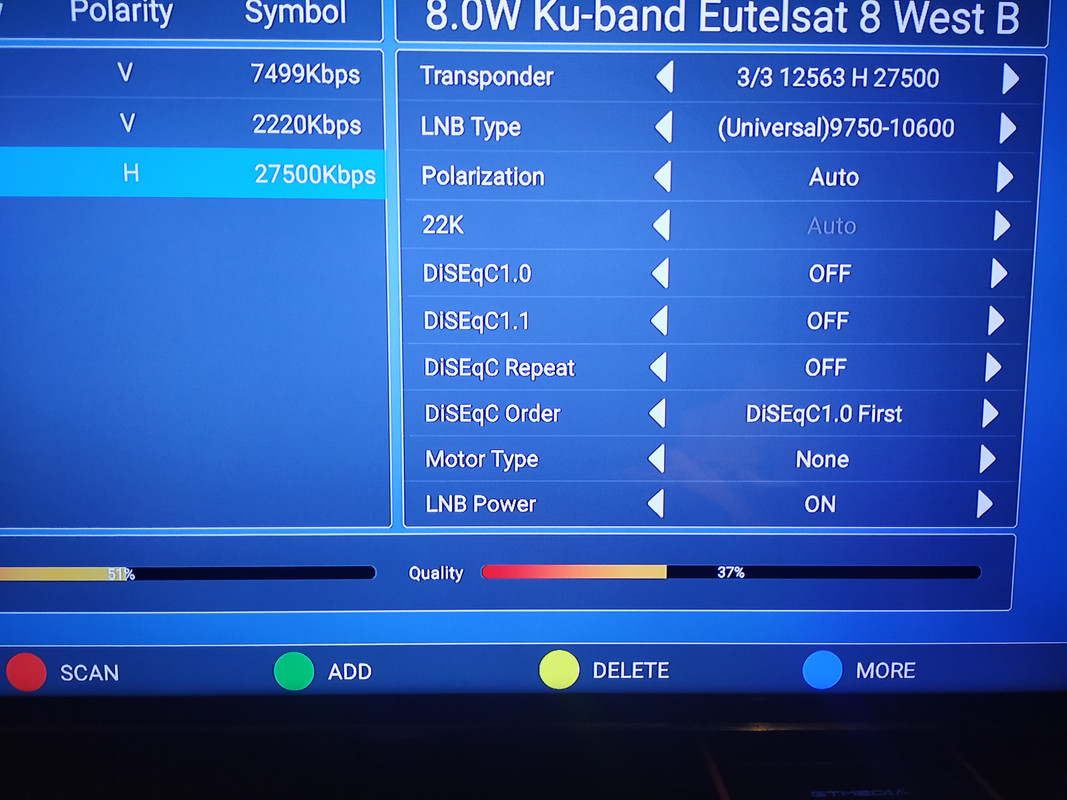 Pana acum nu am fost interesat de acest satelit pentru ca parea inabordabil pentru zona mea. Dat fiind sezonul racoros am intrat in abordarea lui si m am trezit cu o speranta pe care sper sa o concretizez. Am reusit sa scot semnal ce frizeaza receptia la limita , a frecventei 12563 h 27500 , spotul mena. Sunt curios in zona sudica cum intra avand in vedere faptul ca marja de acoperire scade spre nord.