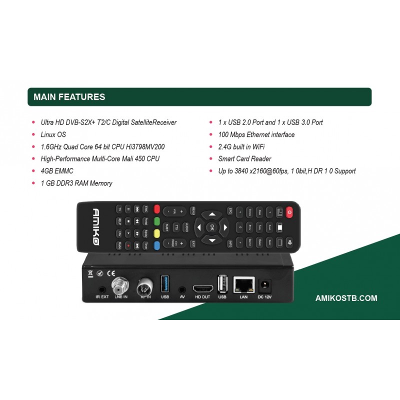 Tip receptor Full HD 1080p, Ultra HD 4K 2160p, MPEG2, MPEG4, H.264, H.265 / HEVC, Linux, DVB-S2, DVB-T2, DVB-C, Conax, Ethernet, Wireless, PVR, FTA Receptor DVB-S2X 4K UHD Multistream