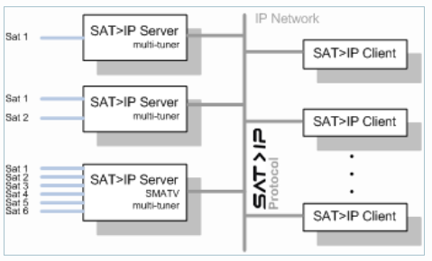 În mediile SAT> IP, tunerele şi demodulatoarele RF sunt eliminate de la clienţii finali şi devin o resursă comună a reţelei IP unde acţionează ca servere pentru programe de satelit live.