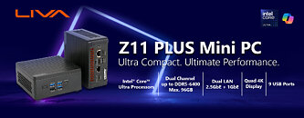 Following its debut at Computex this year, ECS has now introduced the LIVA Z11 PLUS mini PC series. The Z11 Plus is a compact 0.71-liter system (114.4 x 114.4 x 54.5 mm) built to support Intel's Core Ultra processors from both Series 1 and Series 2 offering up to 96 TOPS of AI compute via integrated NPUs alongside Intel Arc graphics. Available processor options include Core Ultra 7 255H (which can be found in ASUS's NUC 15 Pro or GIGABYTE's BRIX Mini PC series), Core Ultra 5 225H, Core Ultra 7 155H, and Core Ultra 5 125H configurations. It supports up to 96 GB of dual-channel DDR5, with Series 1 CPUs running at 5600 MHz and Series 2 pushing up to 6400 MHz. Storage is handled by dual M.2 slots compatible with PCIe Gen 4 x4 NVMe SSDs in both 2280 and 2242 formats.