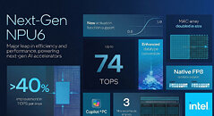 Intel's next-generation "Nova Lake" desktop processor generation will arrive with a 6th-generation Neural Processing Unit (NPU) design. However, we now have preliminary performance details about it thanks to a well-known hardware leaker @jaykihn0 on X. The latest leak indicates that the "Nova Lake-S" desktop configuration will carry an NPU on one of its tiles that deliver 74 TOPS of INT8 performance, which is significantly higher than anything Intel previously shipped in its desktop segment. As of now, Intel ships NPU 3 with "Arrow Lake-S," which came out in 2023 with "Meteor Lake" and offers 11.5 INT8 TOPS. Intel's current highest-performing NPU is the NPU 5 scheduled for "Panther Lake" in early 2026, which will carry up to 50 TOPS for Copilot+ AI PCs.